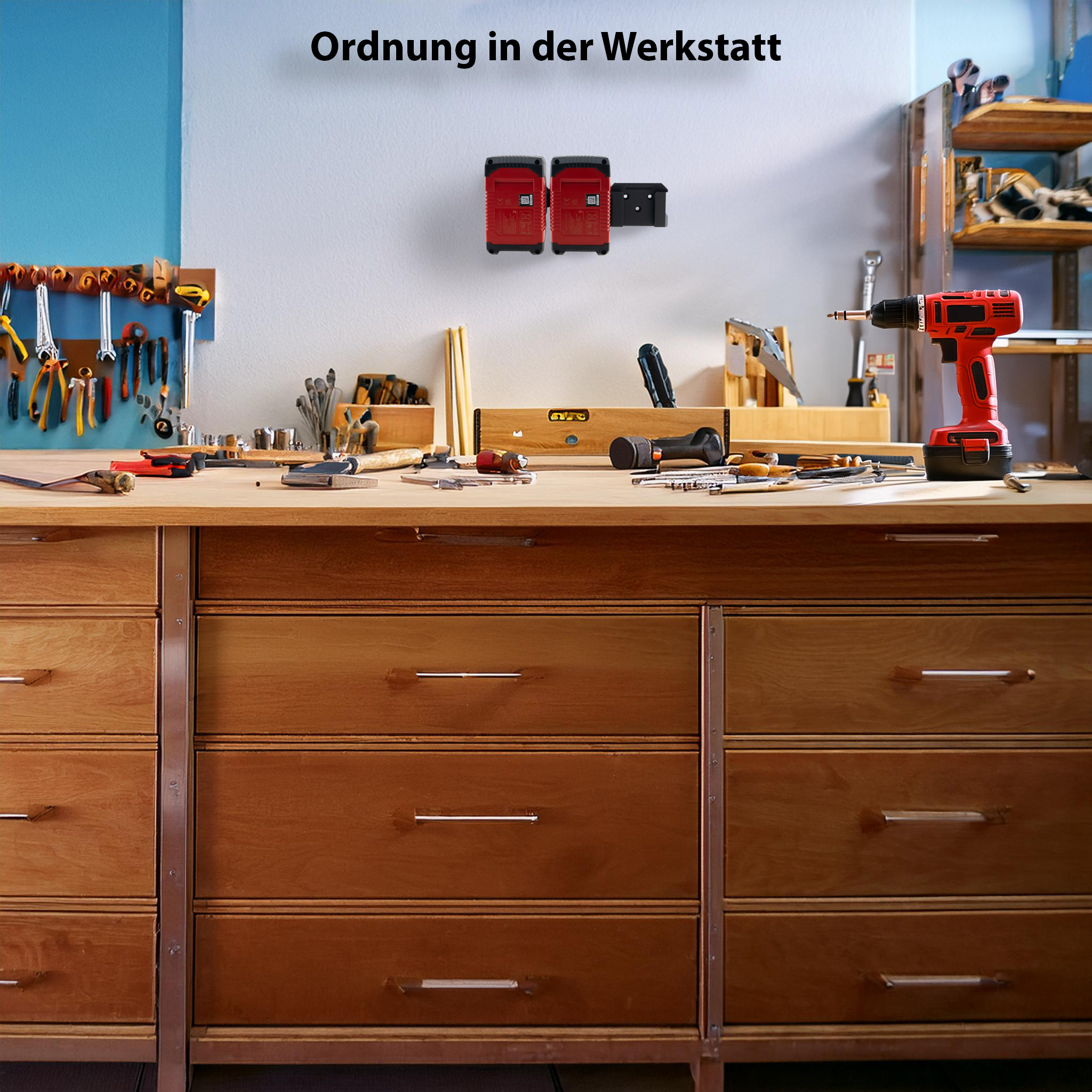 Die Wandhalterung kommt mit fünf hochwertigen Schrauben und fünf passenden Dübeln, sodass die Installation einfach und stabil durchgeführt werden kann. Die Akkus lassen sich einfach in die Halterung einrasten, was für zusätzliche Sicherheit und Stabilität sorgt. Egal ob in der Garage, Werkstatt oder im Lagerraum, diese Halterung ist flexibel einsetzbar und sorgt für Ordnung und Sicherheit.